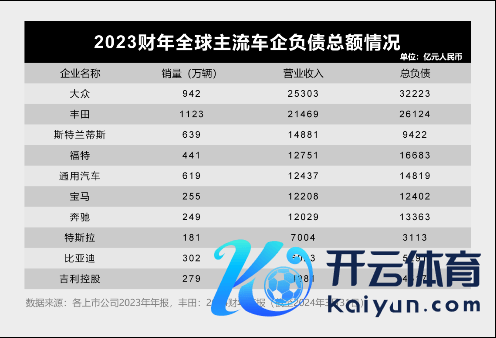 财报露馅,2023年,各人集团总欠债达3.2万亿元;丰田总欠债达2.6万亿元。仅各人与丰田两家头部车企的总欠债就达到近6万亿元,福特、通用、良马、飞奔等车企总欠债也超万亿。不错看到,国外主流车企的总欠债都是“万亿户”,处于较高的水平。