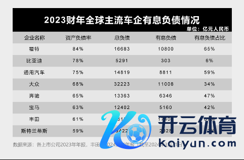 比如,2023年,丰田有息欠债1.7万亿,在总欠债占比达67%;各人集团有息欠债1.1万亿,在总欠债占比34%;福独到息欠债约1.08万亿,在总欠债占比65%;通用汽车、飞奔、良马、斯特兰蒂斯的有息欠债也达到数千亿的范畴。